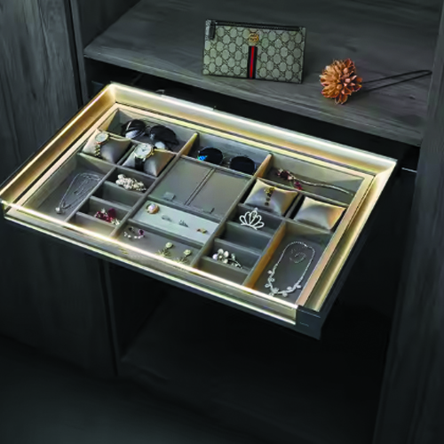 Glass Pull Out Storage Rack Leather Basket with Led Light Clothes Holder Organizer