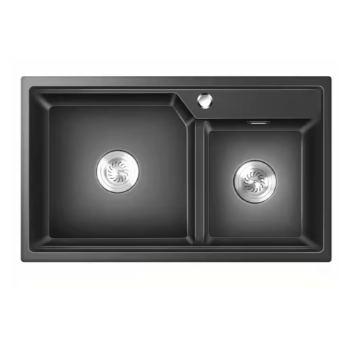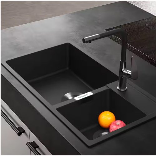 Modern Design Granite Black Quartz Stone Kitchen Sink Hot Double Bowl with Faucet Square Shape Two Holes Drainer Accessory