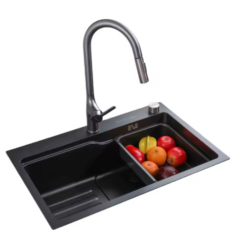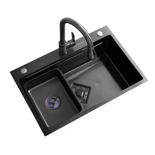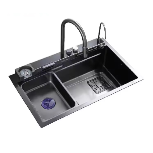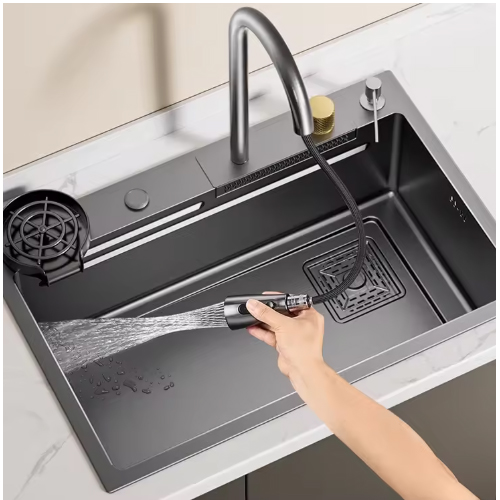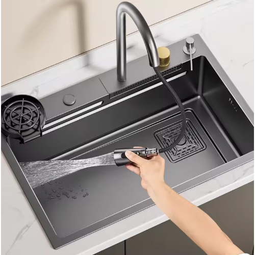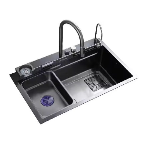 New Design Nano Black Elegant Stainless Steel Waterfall Kitchen Sink Cup Washer Kitchen Handmade Sink